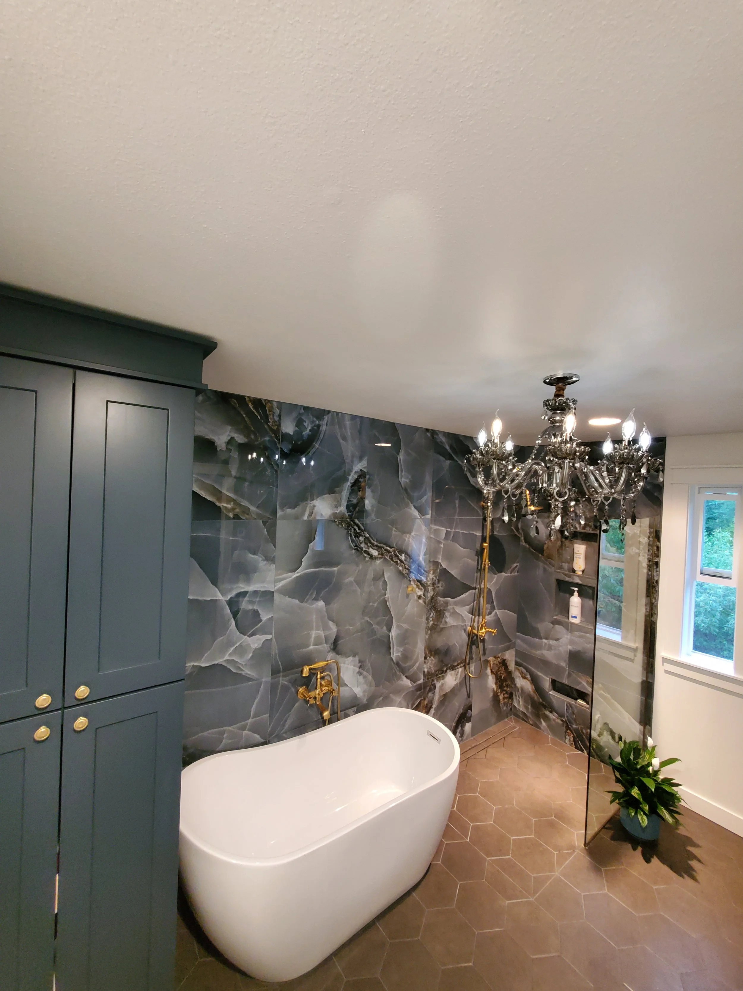 These are a couple of pictures showing of designer flare and style. Chandelier, recessed lighting options and led mirrors. Hidden beneath this beautiful tile floor you’ll find a “warm” surprise. From bidet to shower the floors are fully heated for those fall and winters we love so much.